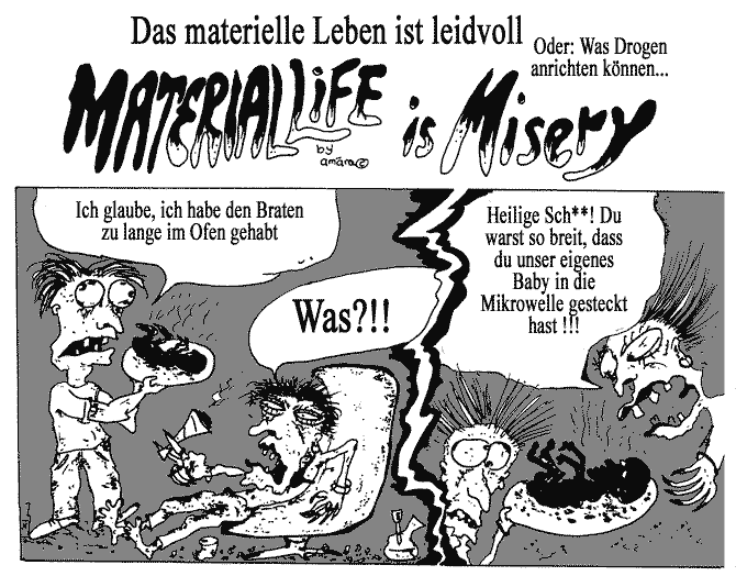 Ich glaube ich habe den Braten zu lange im Ofen gehabt. Was?!! Heilige Sch***e! Du warst so breit, dass du unser eigenes Baby in die Mikrowelle gesteckt hast!!! © by Amara, „Kalpa Vrischa – der Wunschbaum“, spirituelles Straight Edge Hardcore Magazin aus Berlin, ein Blatt, welches uns in den Neunziger Jahren den Anstoß für ein eigenes Journal gegeben hat (!)