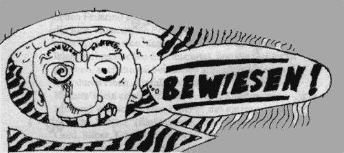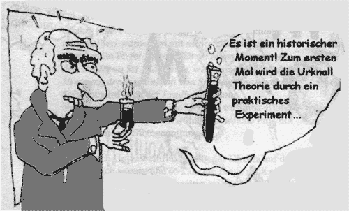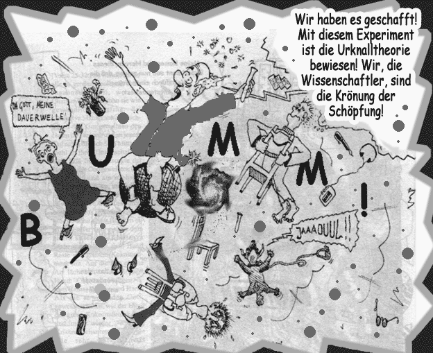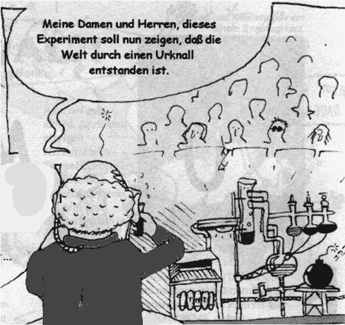 Meine Damen und Herren! Dieses Experiment soll nun zeigen, dass die Welt durch einen Urknall entstanden ist. Dies ist ein historischer Moment! Zum ersten Mal in der Geschichte wird die Urknalltheorie durch ein praktisches Experiment bewiesen! Ich habe jetzt den Zufallsgenerator eingeschaltet und dazu den Sprengstoff entzündet. Dies wird das Ereignis dieses Jahrtausends, und ich werde in die Geschichte eingehen! Sehr geehrte Studenten und Studentinnen, seien Sie nun Zeuge des Urknall-Experiments!!! Also, Udo, ich weiß nicht so recht… Was will dieser verrückte Professor eigentlich demonstrieren?! BUMMM !!! Wir haben es geschafft! Mit diesem Experiment ist die Urknalltheorie bewiesen! Und WIR, die Wissenschaftler, sind die Krönung der Schöpfung! O Gott, meine Dauerwelle!