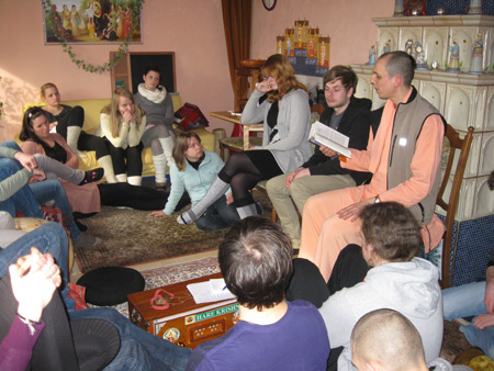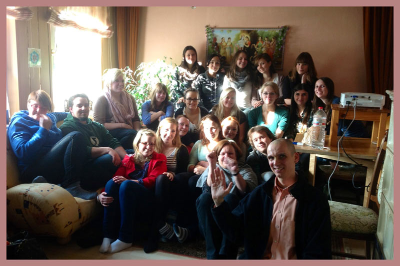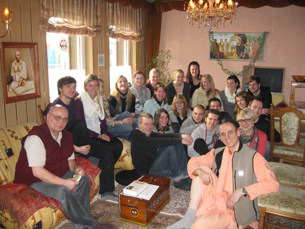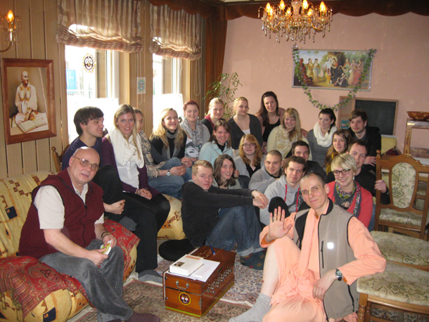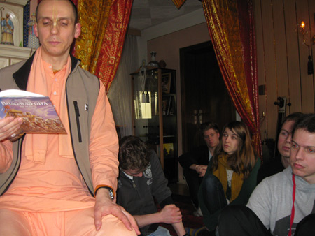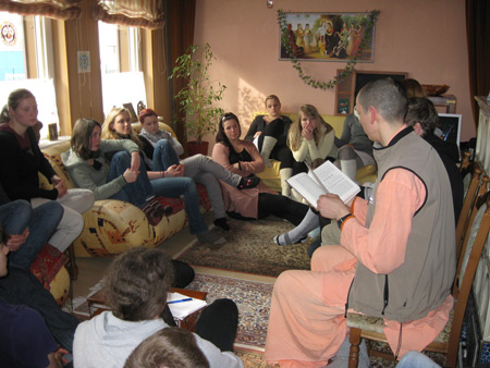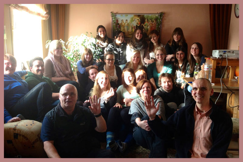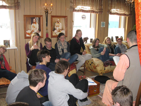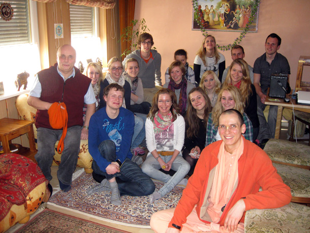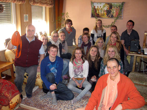 Anfang März 2012 hatten wir dann unseren ersten Unterricht, den wir zur Überraschung der Azubis aber nicht mit Tafel, Pult (und Rohrstock) gestalteten, sondern stattdessen in unserer gemütlichen Tempel-Lounge erst einmal ein paar Hare-Krishna-Lieder sangen. Danach erzählte uns jeder einzelne Azubi, warum er der Meinung sei, der Tod sei ein wichtiges Thema, mit dem man sich besonders als Krankenschwester und -pfleger auseinandersetzen müsse. Im zweite Abschnitt erklärten wir die philosophischen Eckpfeiler der Bhagavad-gita, also den Unterschied zwischen dem vergänglichen materiellen Körper und der ewigen spirituellen Seele, aber auch den Reinkarnationsgedanken, das Gesetz des Karma und die ewige Beziehung zwischen Gott und der Seele. Der dritte Teil bestand aus Fragen und Antworten und einer interessanten Diskussion darüber, wie man dieses Wissen praktisch anwenden kann, besonders dann, wenn jemand im Sterben liegt.