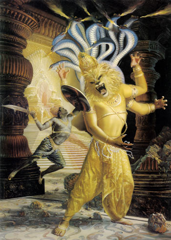 Mit einem Fausthieb schlug der Dämon auf eine der großen Palastsäulen ein. Kaum war das geschehen, hörte man ein immer lauter werdendes Getöse und ein markerschütterndes Brüllen, welches direkt aus derselbigen Säule hervordrang. Hiranyakashipu bekam den Angstschweiß und umklammerte sein Schwert. Schließlich zersprang die Palastsäule in sämtliche Einzelteile und eine schrecklich aussehende Gestalt, die noch niemals zuvor gesehen wurde, kam aus der Säule hervor. Es war Sri Nrisimhadeva, die Persönlichkeit Gottes, in einer Form, die zur Hälfte einem Menschen und zur anderen Hälfte einem gefährlichem Löwen ähnelte. Er hatte scharfe Zähne und lange spitze Nägel und Er brüllte so laut, dass man es im ganzen Universum hören konnte.