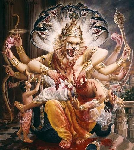 Ein furchtbarer Kampf entbrannte zwischen dem Dämon und dem Höchsten Herrn. Säulen stießen um und Kronleuchter krachten zu Boden. Hollywood müsste wohl alle Register ziehen, um diese Schlacht realistisch nachzuspielen. Nach einer Weile des heftigen Kämpfens, wollte der Herr dem Dämon schließlich ein Ende setzen. So nahm Nrisimhadeva den bösen Vater Prahladas auf Seinen Schoß und riss ihm brüllend mit Seinen scharfen Nägeln die Gedärme aus dem Leib, um sich diese wie eine Girlande um den Hals zu hängen.