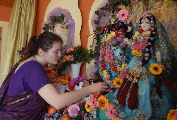 Rasa Viharini: Erst wenn man Krishna-murtis selbst verehrt [das können selbstverständlich auch Gour-Nitai-murtis sein|, versteht man, wie umfangreich Altargestaltenverehrung ist und wie viel Verantwortung dahinter steckt. Ich empfehle allen Krishna-Geweihten selbst einmal die Tempel-murtis zu verehren, wenn sie in der Nähe von einem Tempel oder Zentrum leben. Denn nur so wird die Altargestaltenverehrung sehr erfüllend und vollkommen. Besonders Gottgeweihten, die eine Familie haben, fällt es nicht immer leicht, in ihrem eigenen Heim Altargestalten mit einem hohen Standard zu verehren. Nicht jeder kann eine solch Verantwortung tragen und deshalb ist es besser, wenn solche Krishna-Devotees regelmäßig – wenn es ihre Zeit erlaubt – zu einem nahliegenden Tempel gehen, um dort bei der Altargestaltenverehrung zu helfen. Krishna und Seine Geweihten sind am aller meisten zufrieden, wenn man den Tempeln und Zentren hilft, diese Verantwortung zu tragen, sodass niemand überfordert ist. Ich persönlich habe immer sehr weit entfernt von jeglichen Tempeln gelebt. Deshalb nahm ich diese Verantwortung auf mich, und ich bin sehr zufrieden, wie Krishna alles bereitstellt, um Ihn zu verehren.