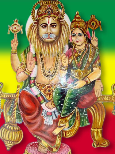 Lord Narasimha zusammen mit seiner Gemahlin Lakshmi-devi. Der Löwe spielt sowohl in der Vaishnava- als auch in der Rastafari-Traditon eine große Rolle.