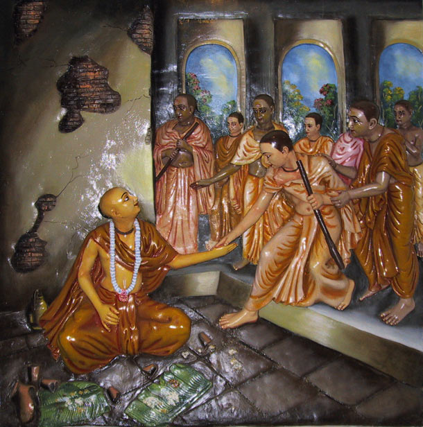 Madhvacharya (1238-1317) war ein berühmter südindischer Vaishnava-Mönch, Philosoph und Reformer, der sich mit zahllosen Argumenten vehement gegen die so genannte Mayavada-Philosophie ausgesprochen hat. Man traf ihn in den meisten Fällen mit zwei gespreizten Fingern an, denn er wollte fortwährend betonen, dass Gott und das Lebewesens immer zwei individuelle Entitäten sind und niemals miteinander verschmelzen können.