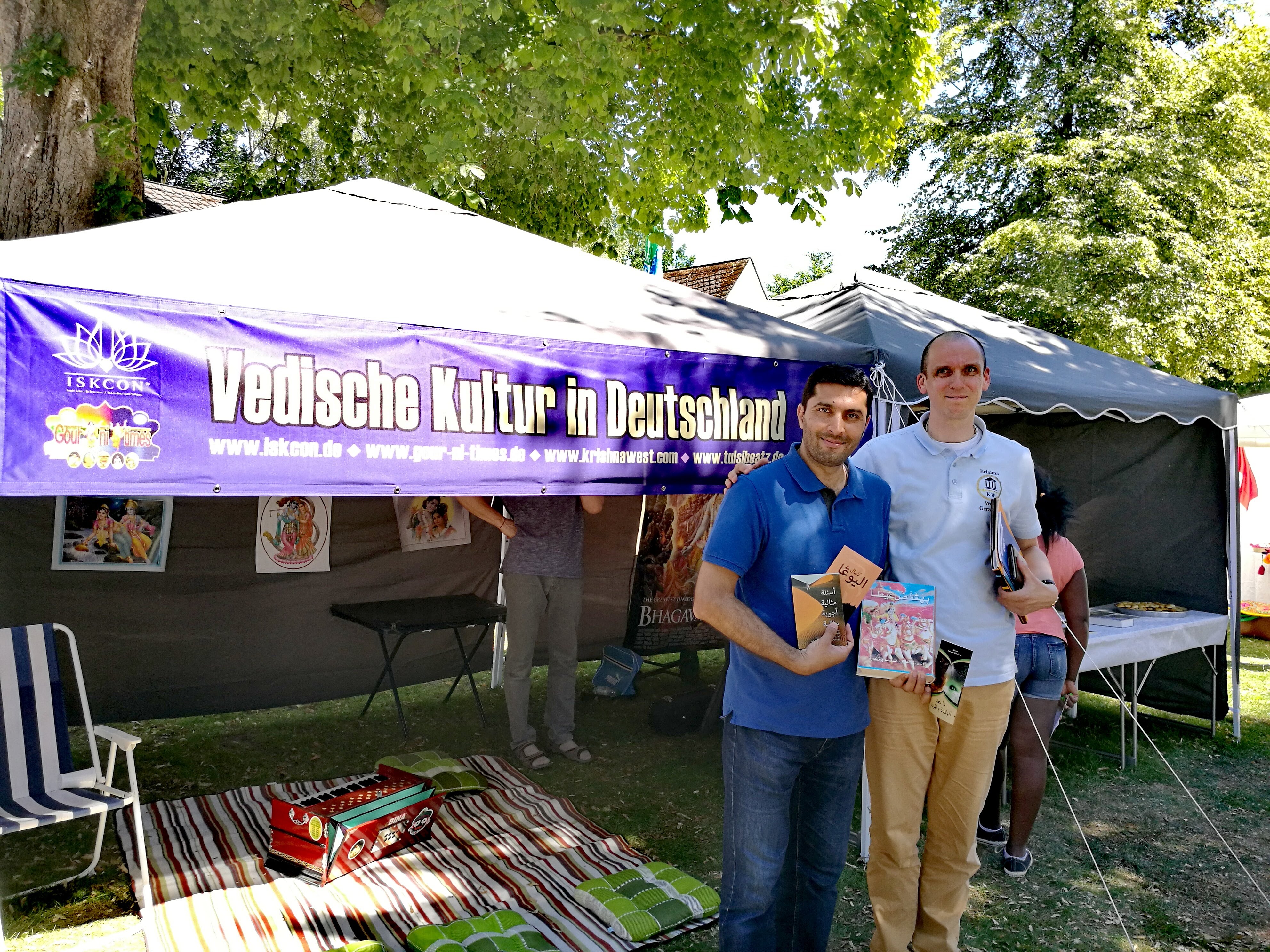 Wir kommen gerade vom “Internationalen Fest der Begegnung” zurück, ein Kulturspektakel, welches seit einigen Jahren jeden Sommer in Paderborn stattfindet. Schauplatz ist der schöne Ziergarten rund um das majestätische “Schloss Neuhaus”. Zusammen mit Vanamali und seiner Frau Icchamayi Radhika hatten wir dort einen eigenen Stand. Ziel dieses Festes ist, dass Menschen andere “fremde” Kulturen näher kennenlernen. So gab es allerhand Buden und Stände, zum Beispiel von den “Deutsch-Iranischen Christen e.V.” oder der “Deutsch-Afrikanischen Gesellschaft Paderborn e.V” oder der “DiTIB Türkischen-Islamischen Gemeinde zu Paderborn e.V.” – und dann plötzlich auch unser Stand mit dem großen schönen Banner “Vedische Kultur in Deutschland”, geschmückt mit vielen Krishna-Postern, einer Mantrameditations-Musik-Ecke und einem Informations- und Büchertisch!