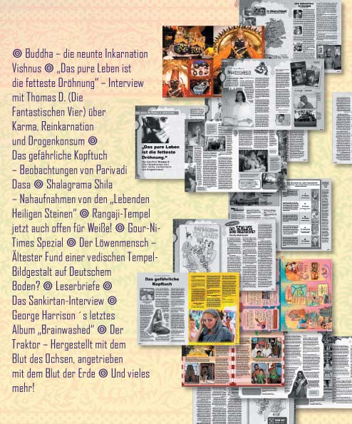 • Fragen und Antworten ohne Tabus • Gespräch zwischen Thomas D. und Ramasundara Dasa über Karma, Reinkarnation und Drogenkonsum • Das gefährliche Kopftuch • Lebende Steine • Das "Pay-Back-System" • George Harrison • Der blutige Traktor • Bhagavad-gita Spezial • und vieles mehr!