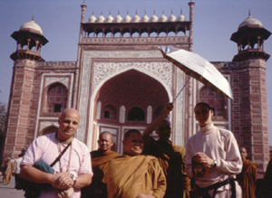 Ein Foto aus dem Jahre 1997: Die beiden Hare-Krishna-Mönche Shivatma Dasa und Paramshreya Dasa vor dem Westeingang des Taj Mahal (Indien) zusammen mit Buddhistischen Pilgern.