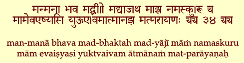 "Beschäftige deinen Geist immer damit, an Mich zu denken; werde Mein Geweihter, erweise Mir deine Ehrerbietungen und verehre Mich. Wenn du auf diese Weise völlig in Mich versunken bist, wirst du mit Gewißheit zu Mir kommen."