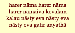 "In diesem Zeitalter des Streites und der Heuchelei gibt es nur einen Weg, um Gotteserkenntnis zu erreichen: Das Lobpreisen der Heiligen Namen des Herrn, das Lobpreisen der Heiligen Namen des Herrn, das Lobpreisen der Heiligen Namen des Herrn!" (Brihan-naradiya-purana 3.8.126)